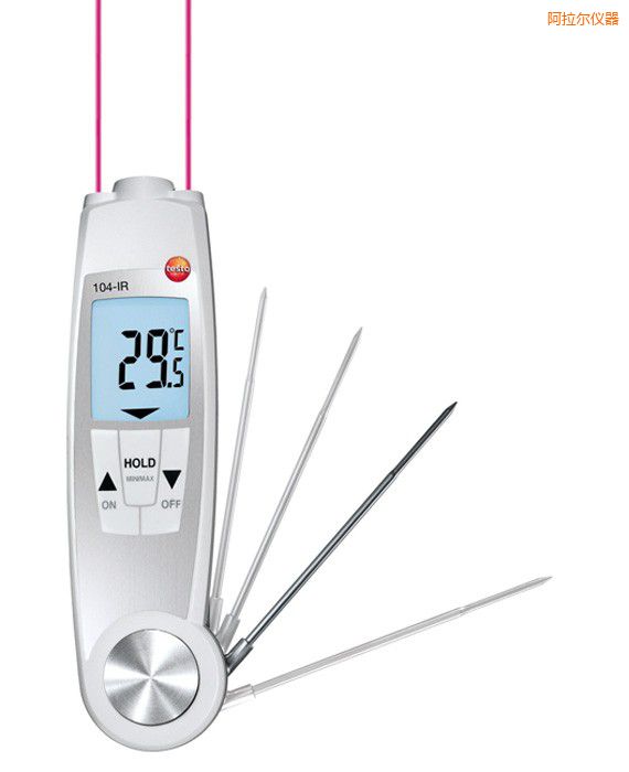 紅外及接觸式測溫二合一testo 104-IR配備精確的2點(diǎn)瞄準(zhǔn)激光,光學(xué)分辨率10:1,測量范圍清晰可見,,可隨時(shí)進(jìn)行快速并精確的表面溫度測量。二合一溫度測量儀特別適用于食品進(jìn)貨檢測以及快速檢測單個(gè)或整箱食品的表面溫度。 刺入式溫度探頭適用于測量如肉類和香腸等食品的核心中心溫度。通常,在紅外表面溫度測量不足以判定食品安全的情況下使用。刺入式探頭在不使用時(shí)可通過折疊方式收入儀器中,以防折斷損壞。