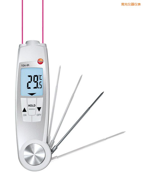 紅外及接觸式測溫二合一testo 104-IR配備精確的2點瞄準激光,光學分辨率10:1,測量范圍清晰可見,可隨時進行快速并精確的表面溫度測量。二合一溫度測量儀特別適用于食品進貨檢測以及快速檢測單個或整箱食品的表面溫度。 刺入式溫度探頭適用于測量如肉類和香腸等食品的核心中心溫度。通常,,在紅外表面溫度測量不足以判定食品安全的情況下使用。刺入式探頭在不使用時可通過折疊方式收入儀器中,以防折斷損壞。
